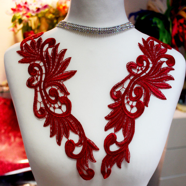 Нашивні лейси (мереживний фрагмент), колір — червоний. Довжина 28 см, ширина 9 см. Чудово підійде для декорування костюмів для спортивно бальних танців, костюмів для східного танцю, вечірніх платтів, аксесуарів для волосся.