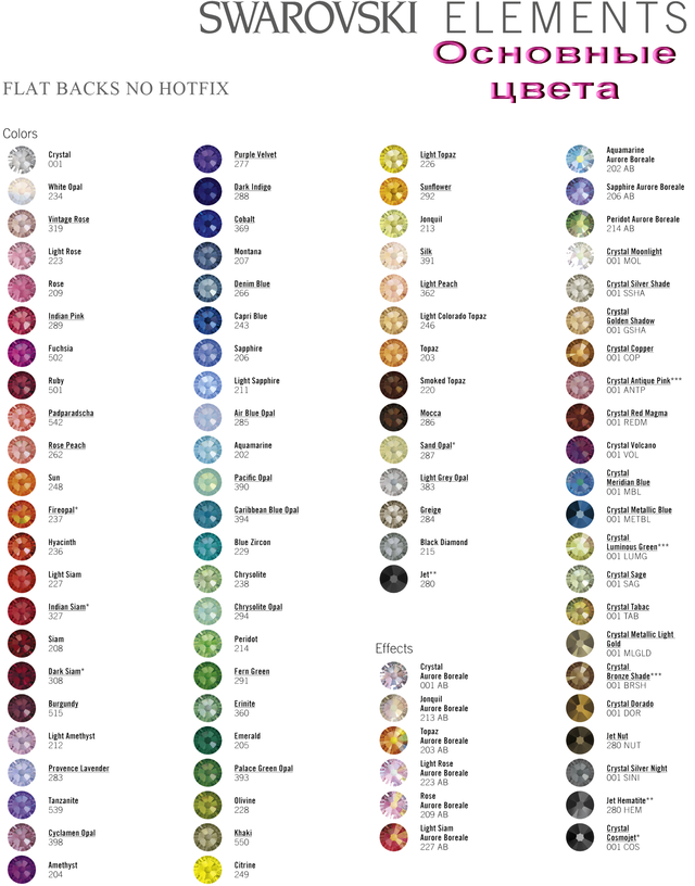 2 групи. Color — звичайні кольорові стрази без жодних спеціальних ефектів і напилень (наприклад Aquamarine, Citrany, Saphire, Rose...)